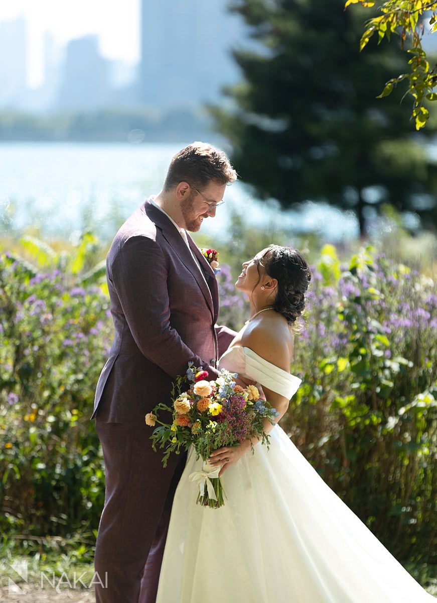 They chose to head to Montrose Beach for photos in nature and the Chicago skyline. The weather was perfect for their late Sept wedding!